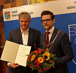 „Karl-Friedrich“ geehrt und gelobt. Der langjährige Leiter des Arbeitslosenzentrums erhält in der Abtei das Bundesverdienstkreuz. Karl Sasserath, seit Jahrzehnten im Mönchengladbacher Arbeitslosenzentrum (ALZ) aktiv, gehört zu den 17 GladbacherInnen, die Oberbürgermeister Felix Heinrichs (SPD) im Ratssaal der Abtei lobte und auszeichnete. Als Heinrichs dem Diplom Sozialarbeiter Sasserath die runde Verdienstmedaille ans Revers heftete, gab es zwischen den Beiden ein lustiges Geplänkel. mehr...