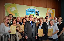 „Sie unterstützen die Stadt in ihren Aktivitäten des fairen Handels. Das ist wichtig, denn es handelt sich um einen gesellschaftlichen Prozess, der nur gemeinsam Wirkung entfaltet“, betonte Reiners. Da Transfair in Deutschland Kommunen und Kreise sowie Universitäten und Schulen auszeichnet, nicht jedoch Vereine oder Initiativen, hat die Steuerungsgruppe Fairtrade Town mit dem OB an der Spitze eine eigene Mönchengladbacher Urkunde entworfen für folgende Einrichtungen: Arbeitslosenzentrum, Elisabethcafé der Grabeskirche St. Elisabeth, Hannes Begegnungszentrum der Pfarre Herz Jesu, städtische Jugendeinrichtung PE 12, Kleingartenverein Pesch, Mehrgenerationenhaus des Paritätischen, Ratsfraktion Bündnis 90/Die Grünen, Ratsgruppe Die Piraten-PARTEI, Tiergarten Mönchengladbach.