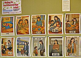 Die Geschichte erzählt von einer Frau, die exemplarisch so oder so ähnlich überall hinter verschlossenen Türen stattfindet. Die Frau, eine Mutter, alleinerziehend, eins im Kindergarten und eins im Grundschulalter, schläft auf der Couch im Wohnzimmer. Sie hat kein eigenes Zimmer, sie steht jeden Morgen um 4.45 Uhr auf, macht sich fertig. Die Taktung ist den ganzen Morgen gegeben, dass genaue Zeiten eingehalten werden müssen, damit sie ihren morgendlichen Ablauf auch schaffen kann. 5:30 Uhr werden die Kinder geweckt- Sie bereitet alles vor, sie macht zwischendurch auch schon mal Vorbereitungen ür das Abendessen, schaut, dass auch die Wohnung schon mal halbwegs sauber ist. Sie bereitet drei Brotdosen vor. Der Sohn fährt mit dem Bus alleine zur Schule. Mit Gongschlag 7 Uhr wird die Tochter in der Kita abgegeben. Und dann kann die Mutter sich verabschieden, schnell auf den Weg zum Bahnhof sich begeben und dort um 7.20 Uhr den Zug zu nehmen. Wenn sie dann um 7.45 Uhr aussteigt und dann noch die letzten Meter zur Arbeit geht, um sich auch noch umzuziehen, Arbeitskleidung anzuziehen, sich quasi dann einzuloggen in das Arbeitserfassungssystem, ist sie dann um 8 Uhr am Arbeitsplatz.