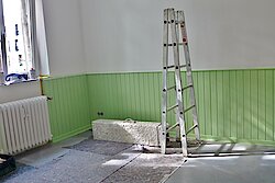Alexander Nickel und sein kleines Team waren gut beschäftigt: da mussten Flächen gereinigt, geschliffen und vorlackiert werden; Türzargen glänzen jetzt im weißen Aqua-Lack, ebenso die Decken. Und die gut ein Meter hohe Wandholzvertäfelung erhielt ein helles Grün – ein Hingucker. ALZ-Leiter Karl Sasserath: „Diese farbliche Helligkeit wirkt sich positiv auf die allgemeine Atmosphäre aus.“ Die BesucherInnen des Mittagstisches sind begeistert, auch Küchenleiterin Marina Nemtsewa. Sie lacht: „Jetzt macht das Kochen mehr Spaß…“