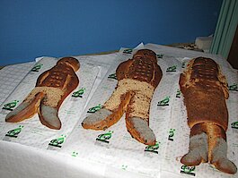 Speziell gehört uns Dank wieder der Bäckerei Hans Oehmen, die uns vielen Jahren mit der Weckfamilie, die hier vorne liegt und darauf wartet, gleich angeschnitten zu werden, spendet.