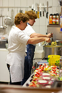 Schon um 6.30 Uhr beginnt der Arbeitstag von Ella Heiniz (53). Heute brutzelt sie Toskana Bällchen mit Kartoffelpüree und Blumenkohlgemüse. Seit 1998 ist Heiniz als Vollzeitkraft Köchin im ALZ. Zur Seite stehen ihr eine weitere Vollzeitkraft und eine Teilzeitkraft. Zu der Stelle kam sie dadurch, dass ihr Lehrer am Ende ihrer Umschulung erfahren hatte, dass das Arbeitslosenzentrum eine vakante Stelle hat. Ihr Lehrer war ein guter Bekannter von Karl Sasserath. Dadurch, dass sie vor ihrer Zeit als Köchin selber arbeitslos war, kann sie sich gut in die Lage der Arbeitslosen hineinfühlen. Heiniz ist es wichtig, durch ihren Mittagstisch die Menschen aus ihrer Wohnung zu holen. „So bekommen sie gesundes Essen und unterhalten sich dabei“, sagt die 53-Jährige. „Viele bauen einen Bekanntenkreis auf, machen gemeinsame Ausflüge“.