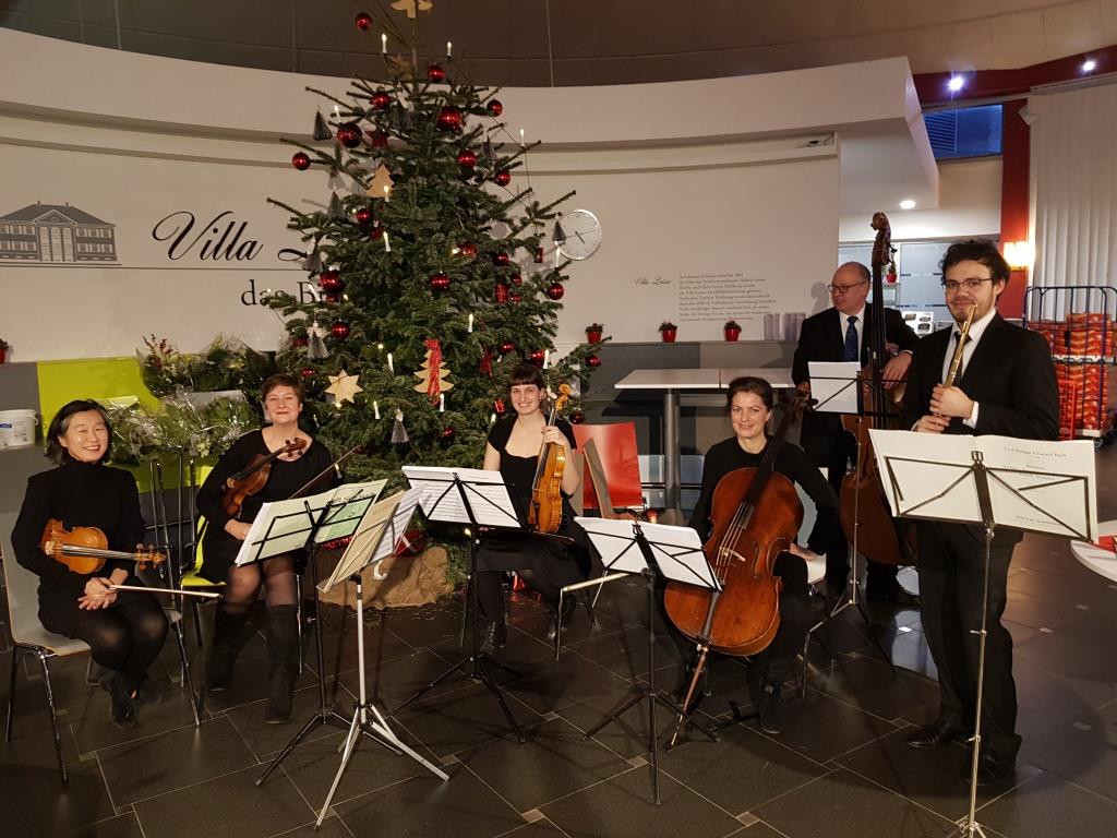 Mit einer kurzen Begrüßung hatte Sasserath die von vielen ersehnte Feier eröffnet. "Wir möchten Ihnen Freude bringen", sagte er. Beim gemeinsamen "Kaffeetrinken" wurden die zumeist älteren BesucherInnen vom ALZ-Team (Mitarbeiter wie Vorstandsmitglieder) bedient. Das dichte Programm begann mit Klassik (Flötenkonzert in d-Moll von Carl Philipp Emanuel Bach) des bekannten Vitusquartetts, bestehend aus mitgliedern der niederrheinischen symphonikern. Wobei diesmal sechs Musiker mitwirkten. Herausragend Flötist Dario Portillo Gavarre.
