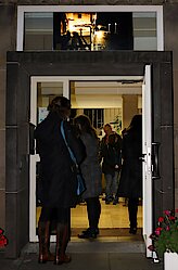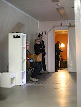 Bevor ich zum Ende komme noch ein paar organisatorische Hinweise. Den Katalog und das obligatorische Getränk zur Eröffnung erhalten Sie in der 2. Etage. Von dort geht es in die ehemalige Hausmeisterwohnung im Dachgeschoss, wo sie die Gelegenheit haben LANDSCAPE ABTEIBERG zu sehen und zu hören.