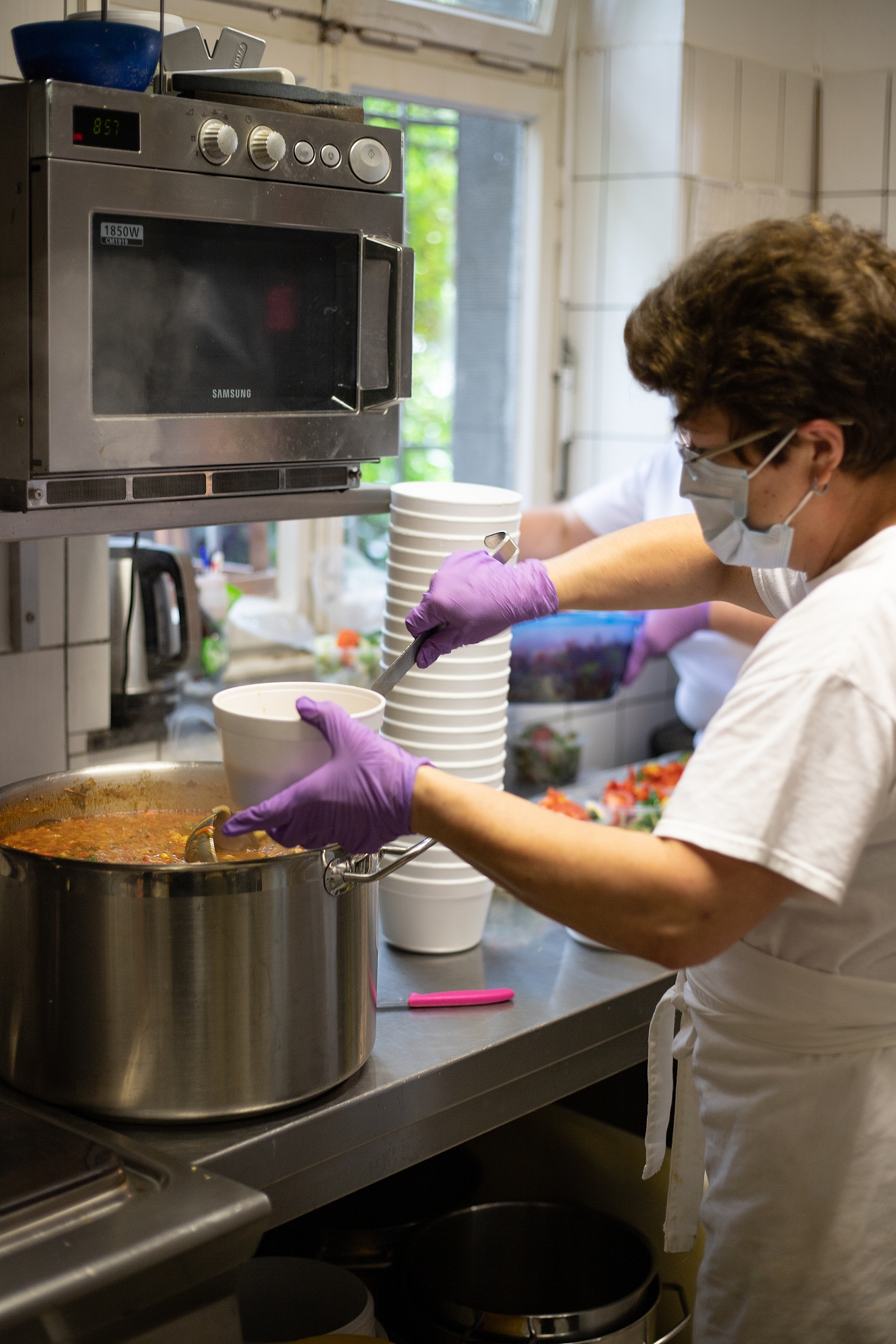 Essen: Nunmehr werden werktäglich 55 Essen "ambulant" an Bedürftige (sie müssen sich anmelden) ausgegeben; sie werden komplett in der ALZ-Küche zubereitet. Diese kostenlose Menüausgabe im Styropor-Behältnis, damit es warm bleibt, findet jetzt von montags bis freitags statt. Samstags/ Sonntags gibt es erst einmal keine Speisen aus der ALZ-eigenen Küche. Sasserath: "Wir, also unser Team, arbeitet in Corona-Zeiten mehr als vorher." Aus Gründen der Fürsorge sollen einige Mitarbeiter am Wochenende frei machen. Die Kosten für die Mahlzeiten bezuschusst das Zentrum mit dem Geld der "Aktion Mensch", sagt Sasserath. Die Einschränkung bedeutet nicht, dass es samstags, sonntags für ältere Arme, für Alleinerziehende mit Kindern etc. nichts gibt. Denn bei Sasserath meldete sich eine Gruppe junger Leute - Künstler, Erzieher, ein Koch - die "nicht reden, sondern was tun wollen". Sasserath nahm sie beim Wort: Vorgesehen ist nun, dass die jungen Helfer "ein kleines Wochenend-Menü" zusammenstellen. Wie viele Essen es vor dem ALZ-Eingang mit dem nötigen Sicherheitsabstand gibt, das ist im Moment nicht klar. Klar ist, dass die Zutaten vom ALZ und damit über die "Aktion Mensch" bezahlt werden.