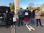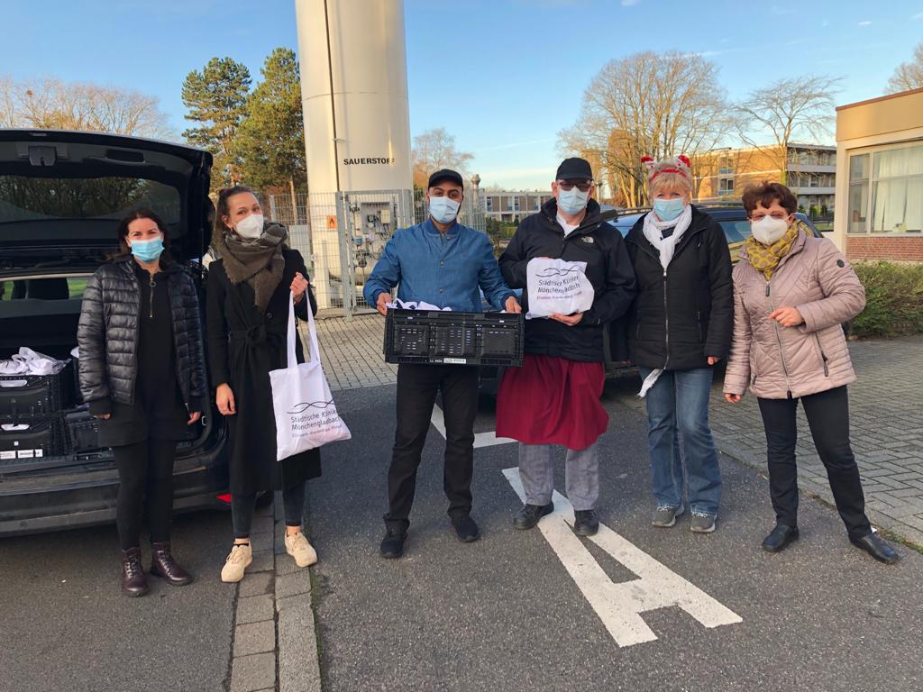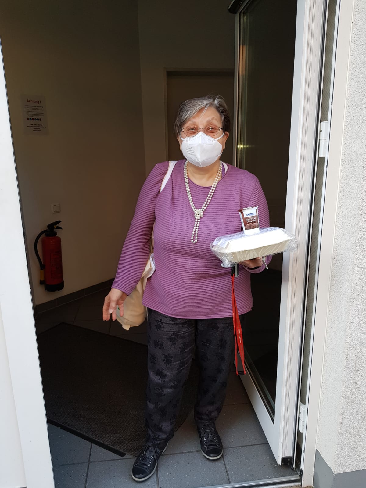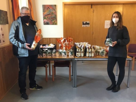 Am 18. Dezember gingen die HelferInnen „on Tour". Zuvor hatte Justine Krause die Verteilpläne aufgestellt, fünf Teams mit zwei Personen gebildet: Eine(r) fährt, eine(r) bringt’s direkt - mit Abstand - ins Haus, viele Treppen steigen nicht selten inclusive. Durch die Stadt fuhren auch zwei Awo-Ehrenamtliche; die Hilfsorganisation bietet u.a. „Essen auf Rädern“ an, ist für Aktionen wie diese also bestens ausgestattet.