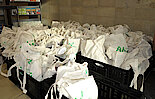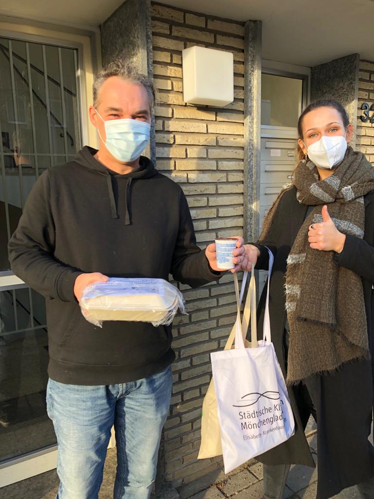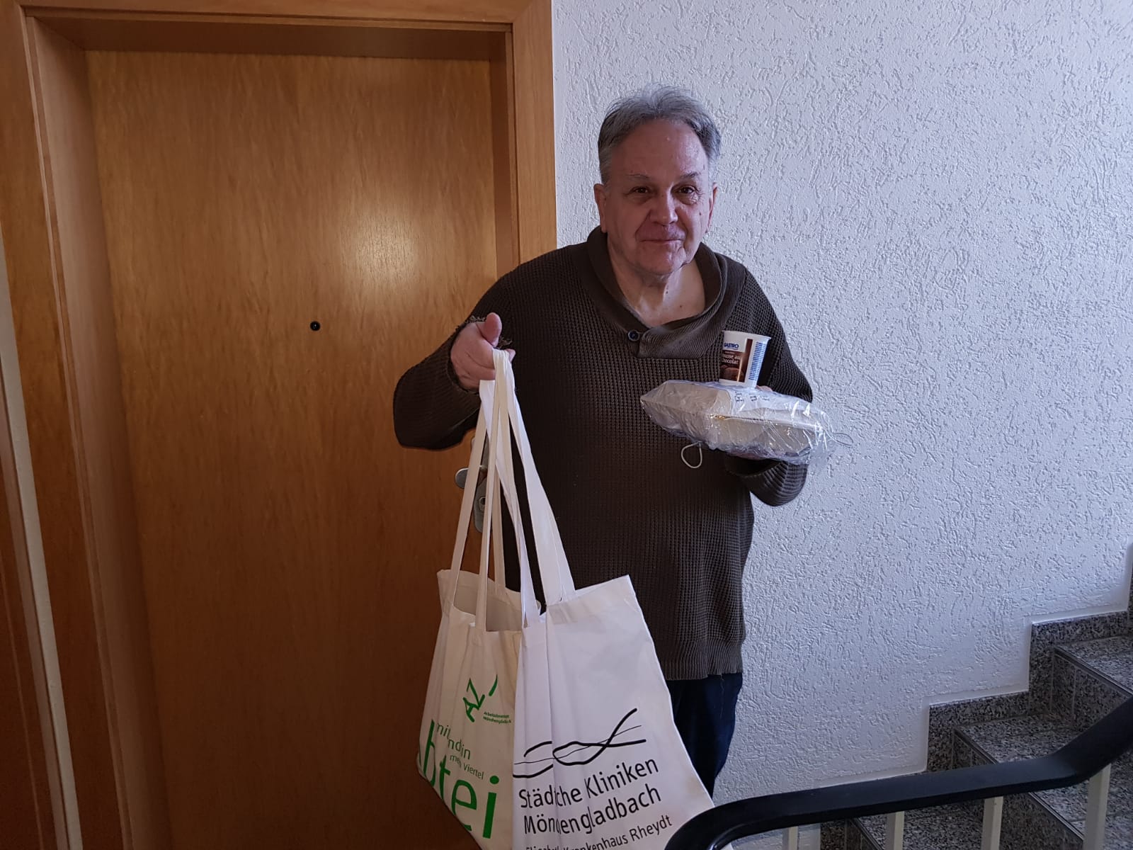 Hinzu kam für jede Person eine größere Jutetasche mit dem neuen Quartiers-Logo des ALZ und leckeren Sachen wie Pralinen, Gebäck, Süßigkeiten, Säften, Clementinen, kleinem Weckmann, Stollen etc.. All das wurde mit Unterstützung zusammengetragen oder gespendet von Privatleuten, vor allem aber vom Café-Bäckerei Ö, der katholischen Kirche, vom Gebäudereiniger P&M Michael Jansen und Edeka Endt. Außerdem floss ein Geldbetrag der „Aktion Mensch“ in die weihnachtliche Aktion. Dazu gab es noch einen Beutel pro Haushalt gefüllt mit Hygieneartikeln, gespendet von den Städtischen Klinken Mönchengladbach.
